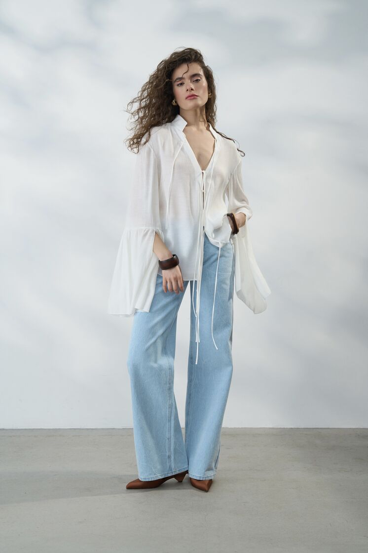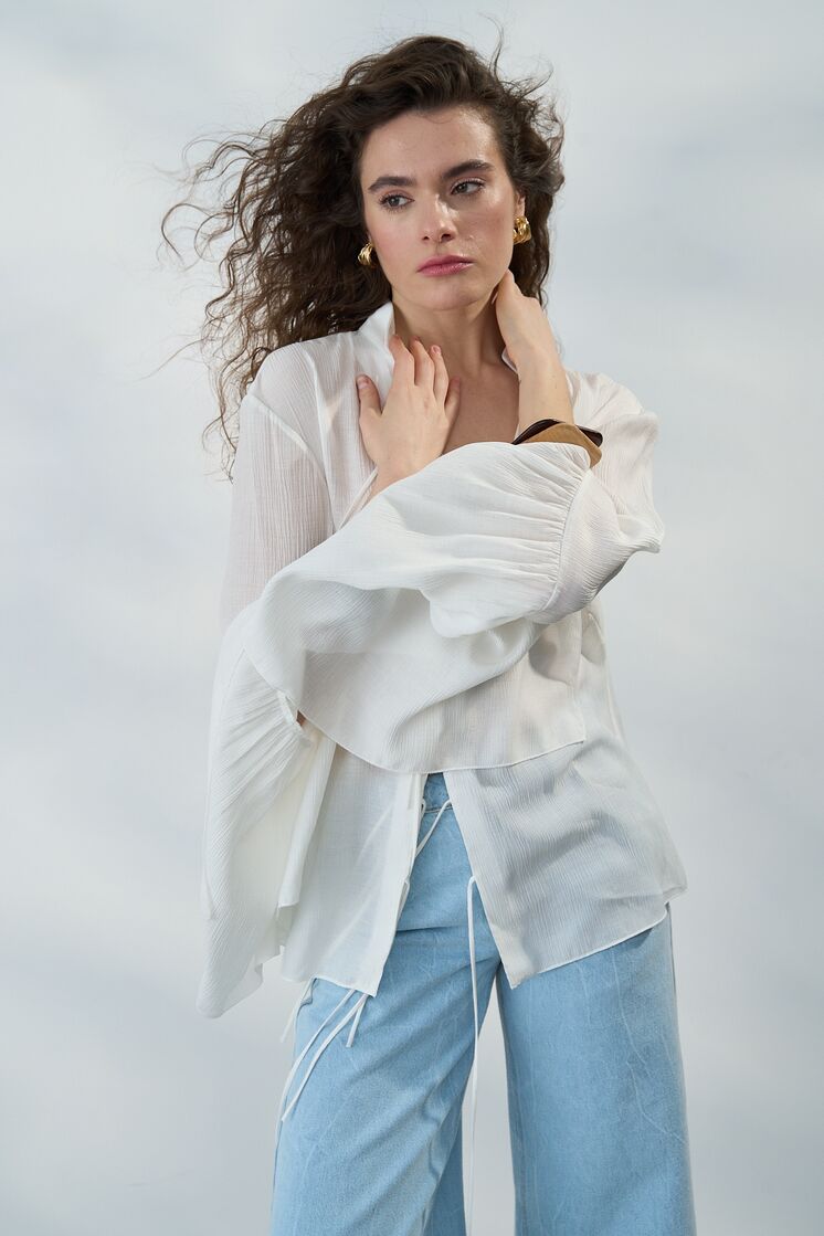 Блуза создаёт интересный визуальный эффект и добавляет объём образу, при этом оставаясь лёгкой и комфортной в носке. За счет разреза на рукаве она как-бы парит при движениях и, при этом на руке хорошо будут видны акцентные аксессуары.